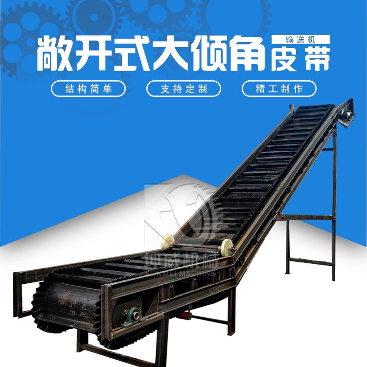 1、大傾角輸送機(jī)的輸送帶采用波形擋邊和橫隔板,有效地減少了物料輸送過(guò)程中散落的問(wèn)題,大幅度提高了物料輸送效率。